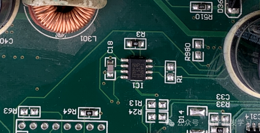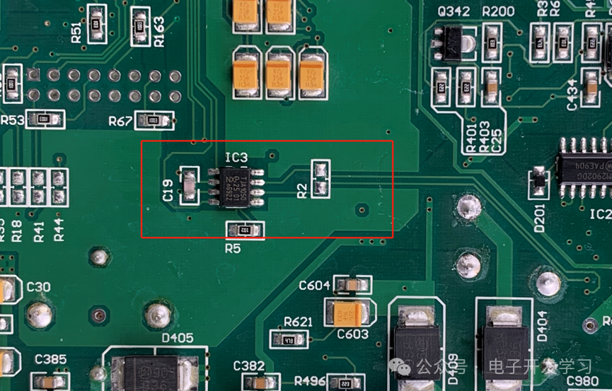 右上角有一个SP232EEN,这是一颗RS232收发器。左下角的SOP-8封装的芯片是FM25256BG,是一颗256Kb的非易失性铁电存储器。