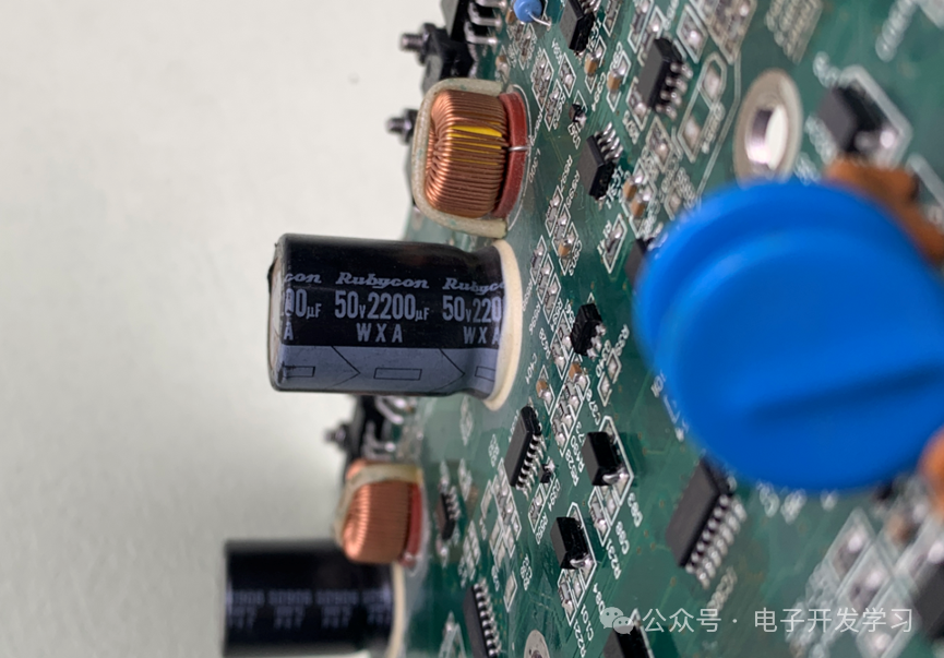 板子上总共有三颗50V2200uF的电解电容,来自日本Rubycon,也就是通常说的红宝石电容。