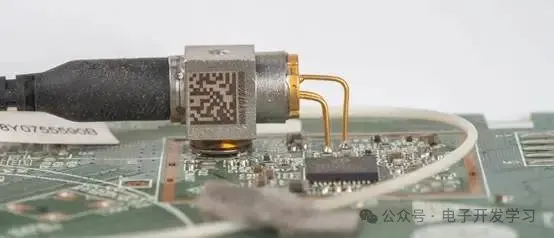 接下来看看光纤收发器,这是一个同轴尾纤激光器。座子底下有5个引脚,一般情况下这五个引脚是供电、地、调制信号,在一些高端产品中另外两个引脚是TEC温控引。尾部的三个引脚显而易见是激光发射器LD的三个引脚了。