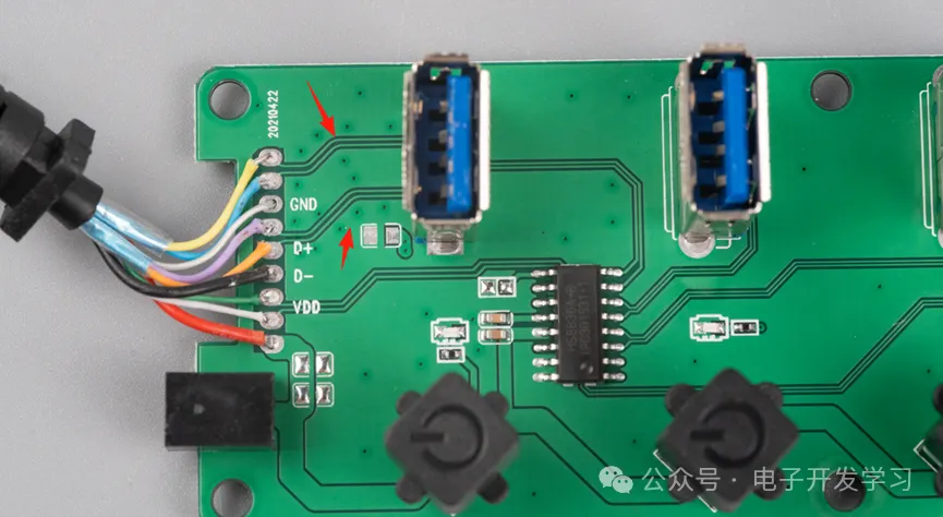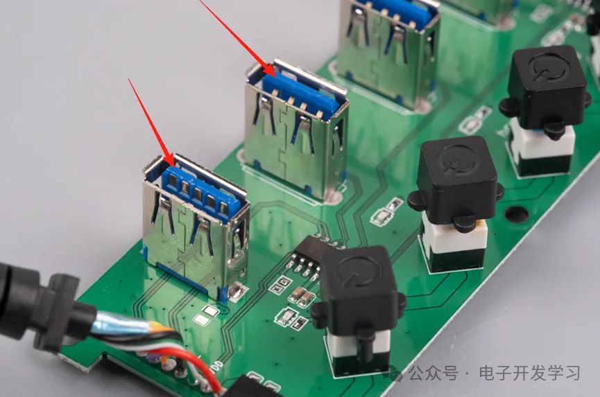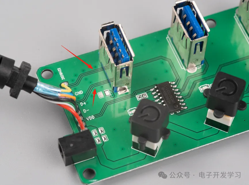 但是盒子上写的USB3.0又是什么讲究呢?仔细看布线,发现从尿袋线进来的两组差分信号直连到了第一个USB连接器,这两组信号肯定就是USB3.0的SS信号了。另外,从第一个HUB上引出了一组USB2.0信号连接到了第一个USB连接器。这样,对于第一个连接器来说,USB2.0和USB3.0信号都有了。好好好,反正USB3.0它确实有了对吧,人家也没说7个口都是USB3.0,谁让我自己对号入座呢!