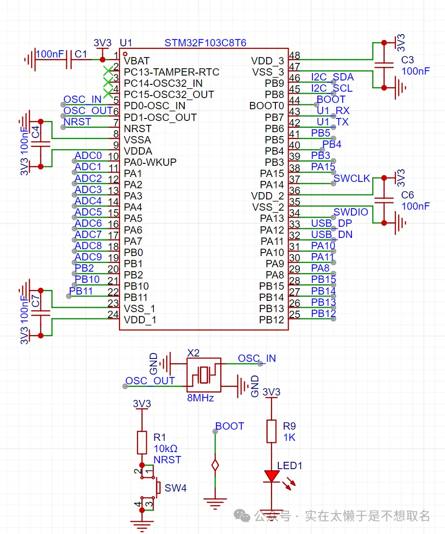 主控采用STM32F103C8T6,也是非常熟悉了,不做过多介绍了,为了减小尺寸,晶振采用3225的SMD封装晶振。