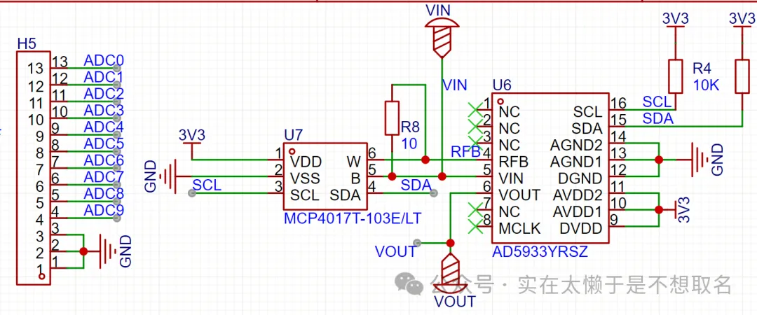 同时,STM32引入9路ADC通道可以进行电压测量。数字电位器采用MCP4017,规格选用104。