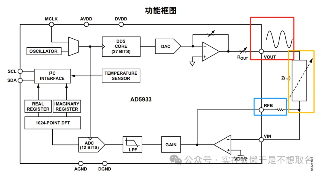 我们可以看到AD5933的测量原理主要是由VOUT提供一个激励源给阻抗Z,阻抗Z和反馈电阻RFB构成了一个反向放大电路,通过内部的PGA增益GAIN放大,再通过一个低通滤波器由内部ADC采样后,经过DFT运算单元后获得实部虚部再进行输出。