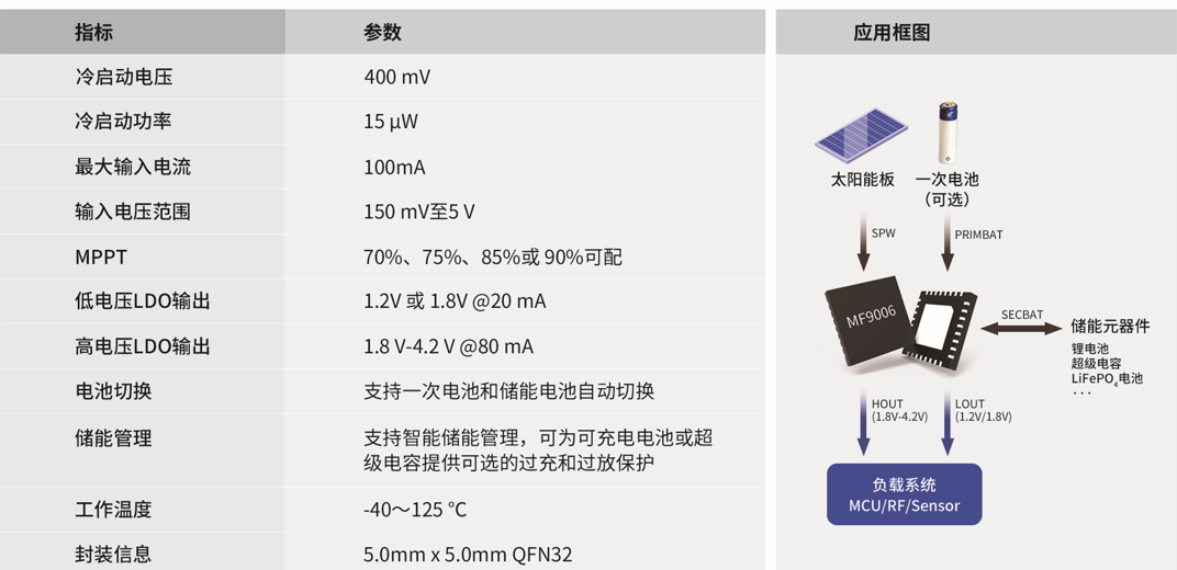 超低功率启动:400 mV 输入电压和15μW 输入功率下可实现冷启动;