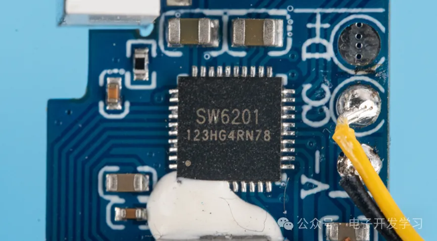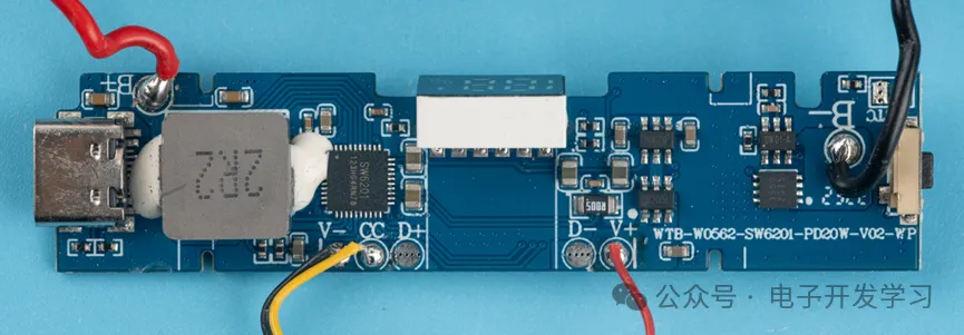 使用了一颗智融的SW6201,这是一颗支持PD的多协议双向快充移动电源IC。电流最大5A,支持JEITA规范,输出功率最高18W,效率最高95%。输出的快充协议支持PPS/PD3.0/PD2.0/QC4+/QC4/QC3.0/QC2.0/AFC/FCP/SFCP等等。输入的快充协议支持PD3.0/PD2.0/AFC/FCP等等。还内置了电量计和188数码管显示驱动以及3-5个LED指示灯驱动。根据以上参数来看,这是专门为充电宝方案设计的IC。