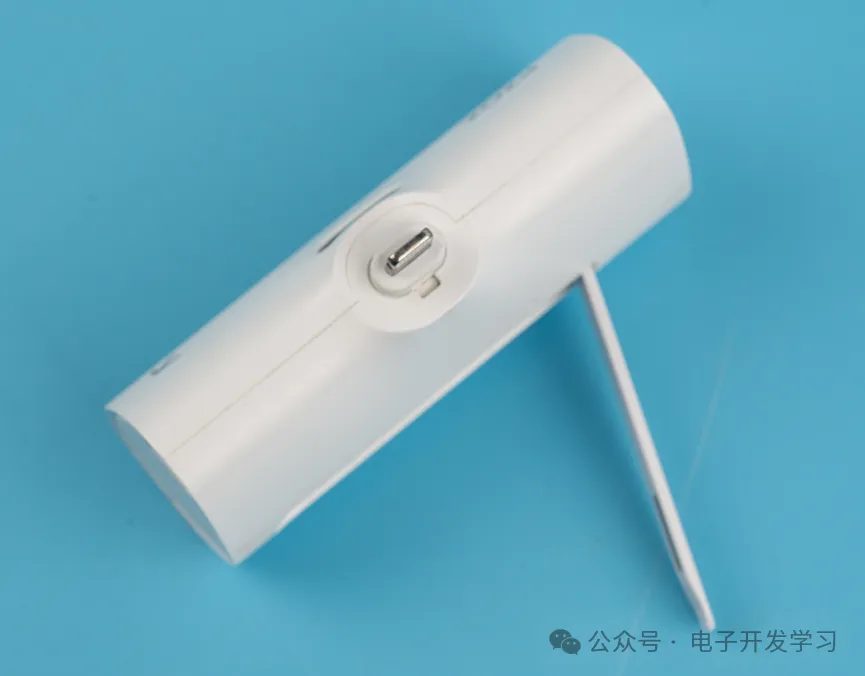 这个支架是金属的,上面还镶嵌了一个磁铁,用来确保不适用的时候,支架吸合在充电宝外壳上。