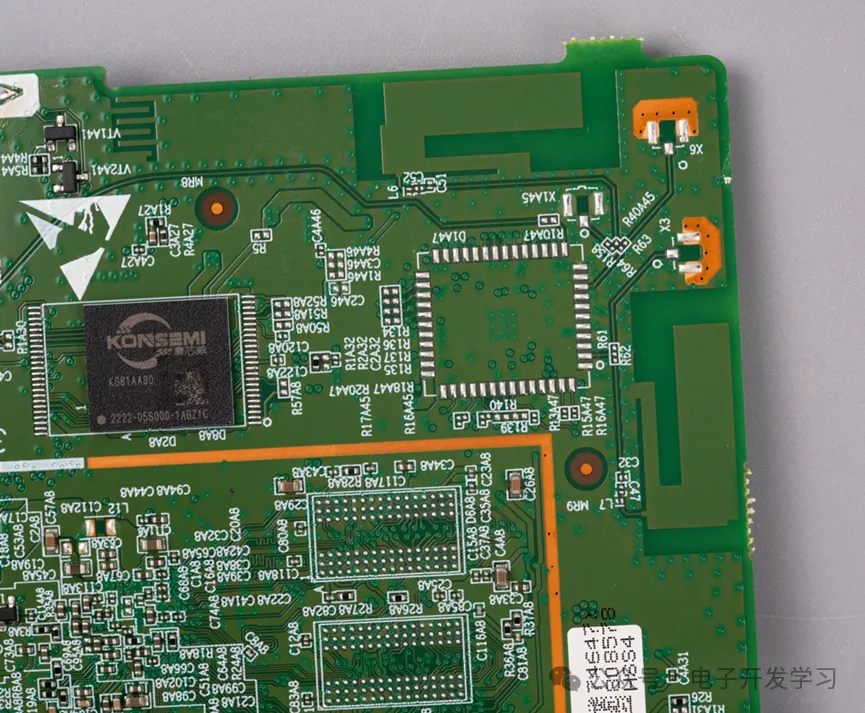 板子背面还有两个DDR安装位置,但是实际上也没有贴装。右上角看起来是一个无线模组,未贴装。板子背面只能看到一颗康芯威Konsemi的KS81AA80 8GB EEPROM电擦除只读存储器。