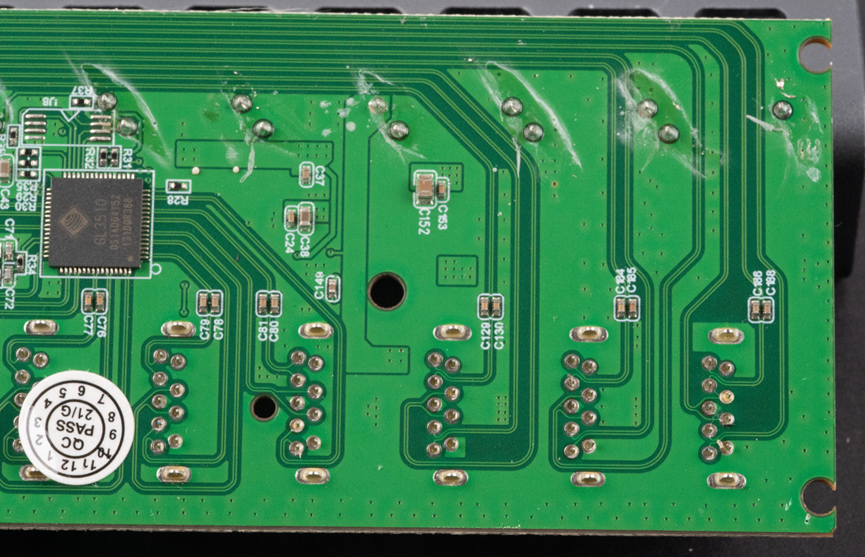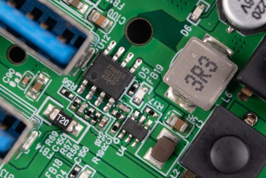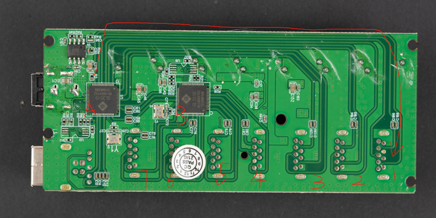 板子背面左上角也是一颗FR9855,这个BUCK的电感在板子正面。另外可以看到板子背面放置了两颗HUB芯片。USB3.0的高速走线也在板子背面。