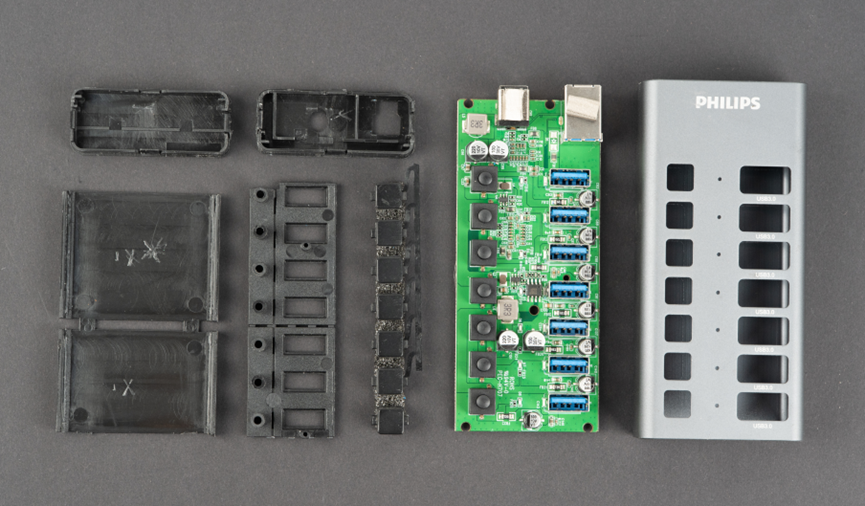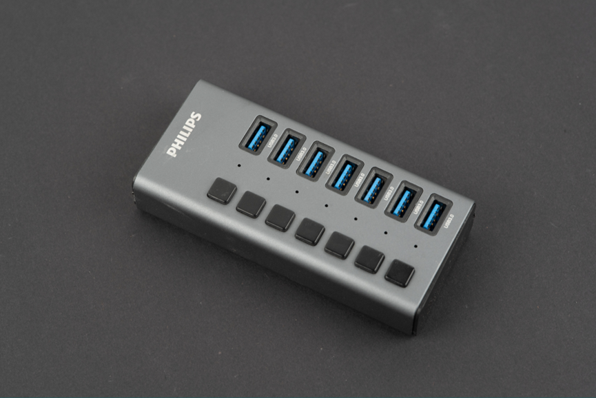 这是一个飞利浦USB3.0集线器,可以通过1个USB扩展出7个USB3.0接口,每个接口带独立的供电切断开关。