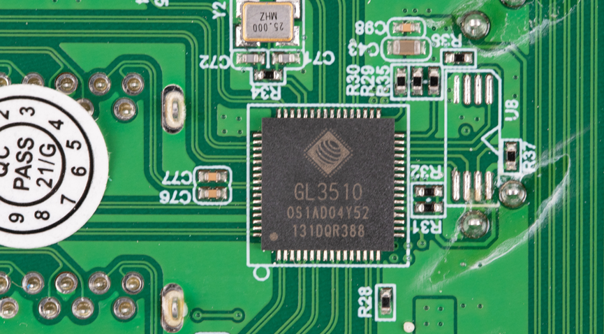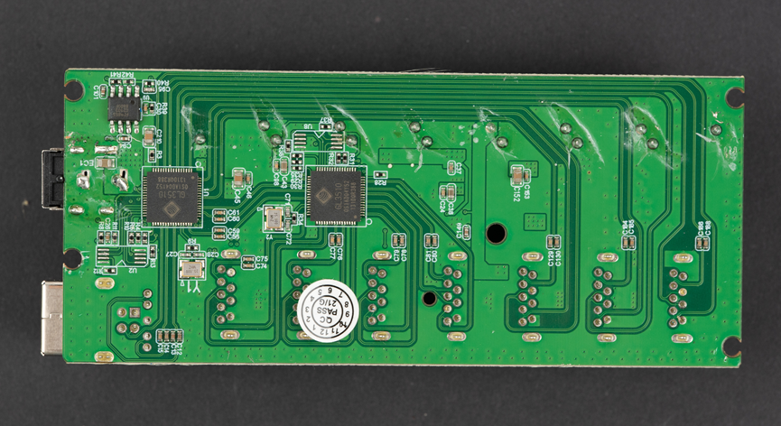 HUB芯片是GL3510,这是一颗USB3.1 Gen 1 Hub控制器。这个芯片价格大概在6元左右。每个芯片可以扩展出4个USB3.0接口。那么为啥两个芯片不是扩展了8个接口呢?