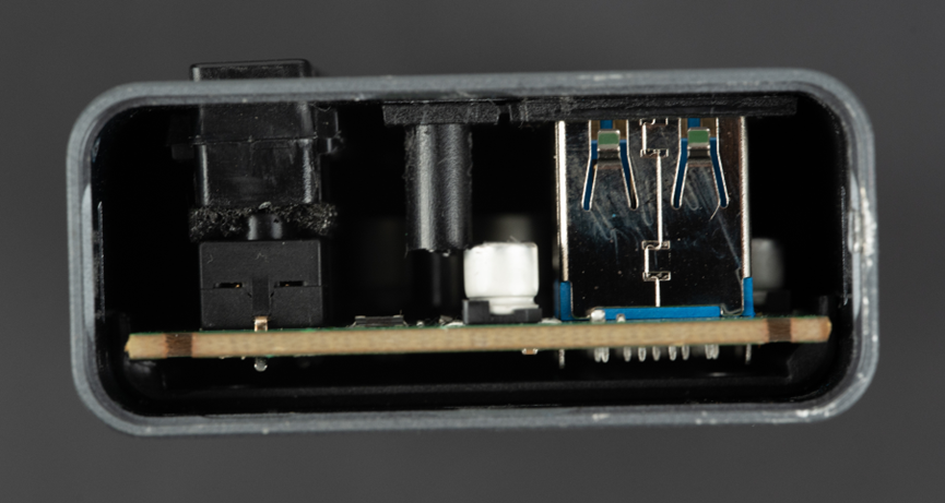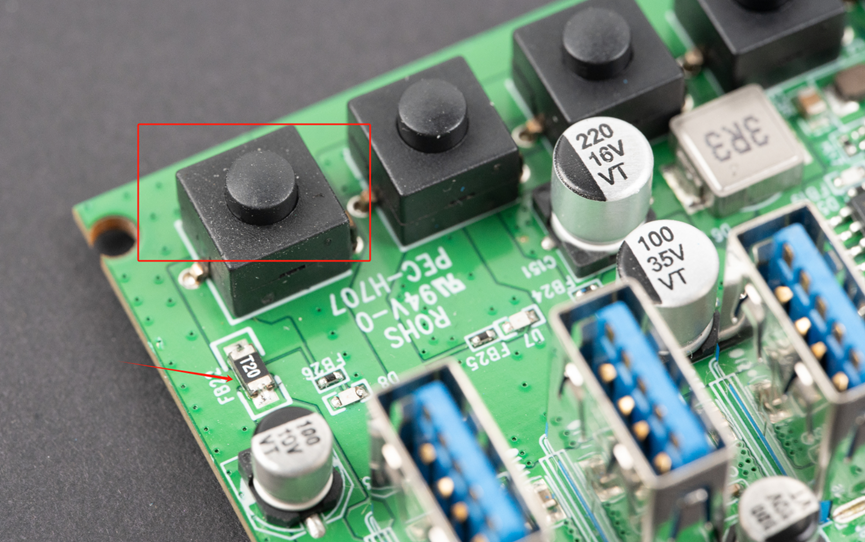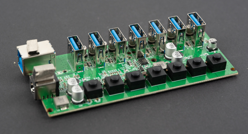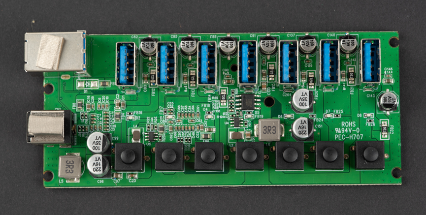 板子正面看着挺工整的。七个USB3.0输出口,对应七个按键开关。左端是USB3.0输入口和供电接口。
