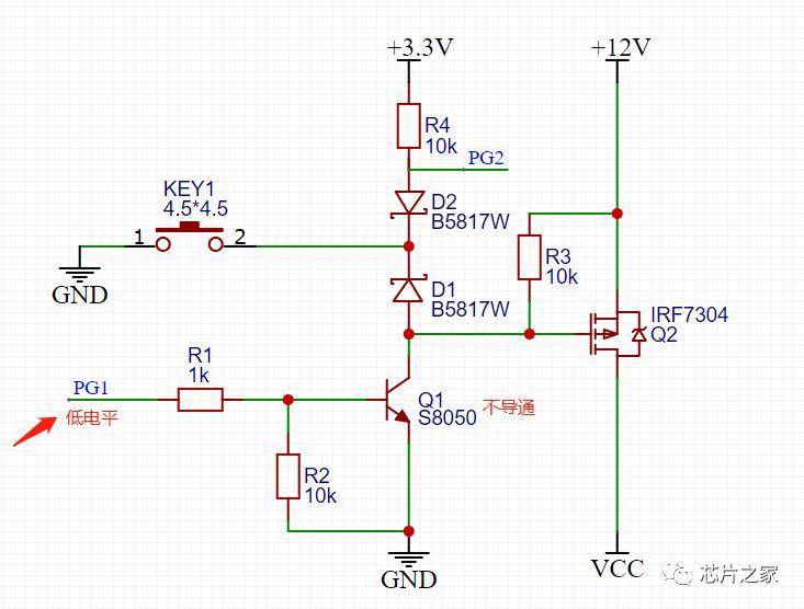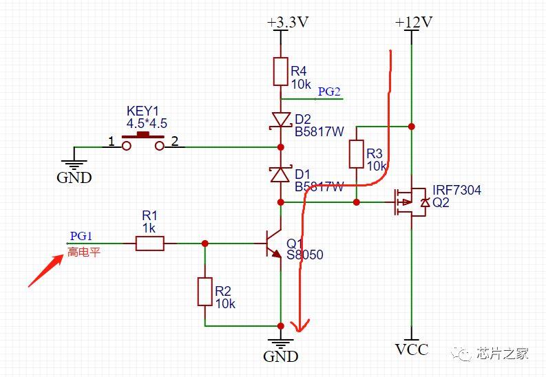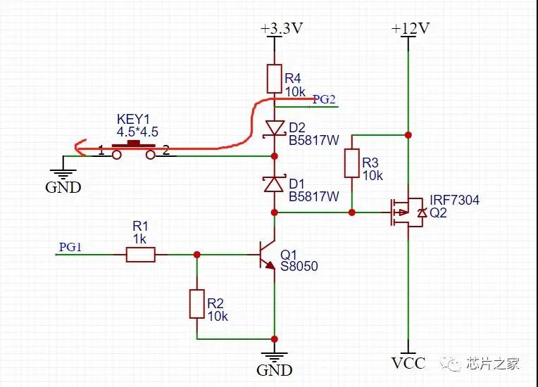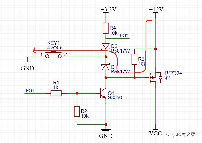 按键没按下之前,PMOS GS两端电压一样,不导通,当按键按下之后,看上图红色回路,G极通过二极管D1接地,PMOS导通,12V电压通过PMOS到VCC,给后级供电,这时候有老铁就要问了,难道我要一直按着嘛,按键松开的话MOS不就关断了。