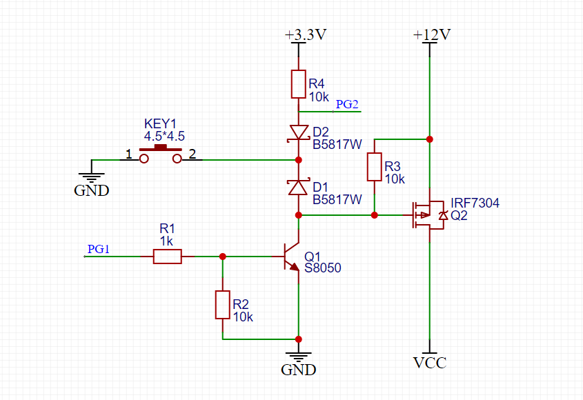 原理其实很简单,就是通过控制PMOS Q2的通断来实现的,当按键KEY1按下的时候,PMOS Q2导通,之后控制Q1导通,就可以实现PMOS一直导通,实现开机,开机之后,可以检测PG2的电平来判断按键的短按,双击,长按等操作。