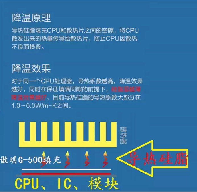 - 在变压器与散热片之间、主控IC与金属外壳之间等间隙低于0.3mm的狭小空间,G500可完全填充空隙,热传递效率比空气提升80倍