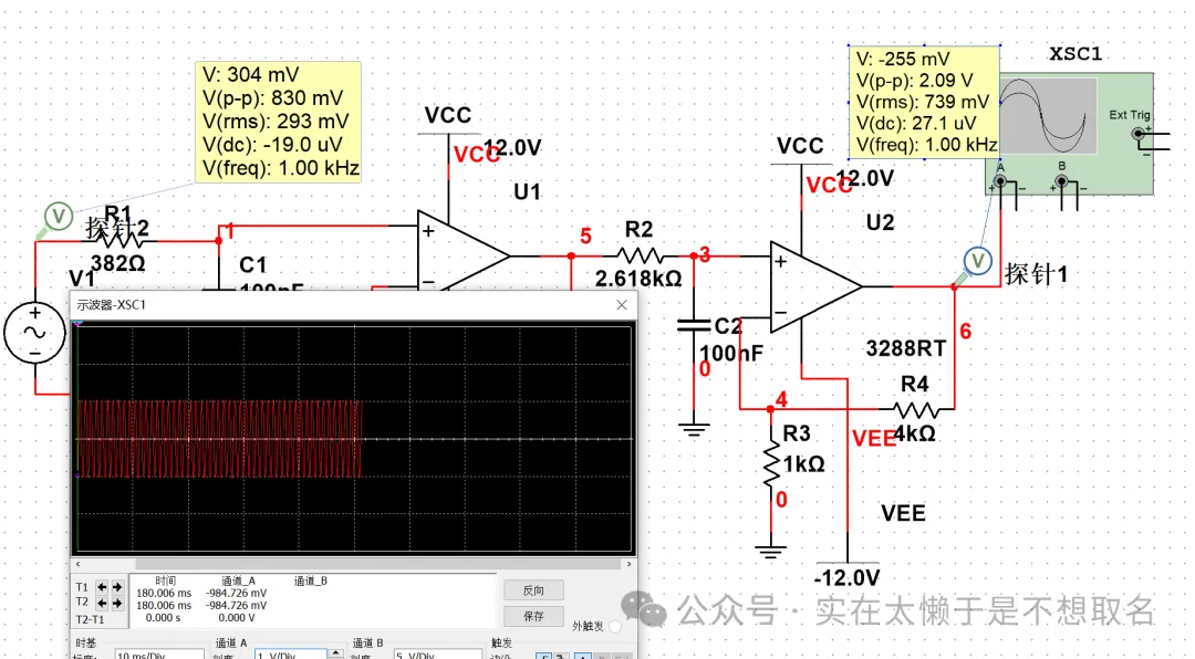 我们从幅相特性曲线中得知1K的时候,Vout/Vin的幅度是0.352db,约为1.203倍,所以只需要输出1K,0.831Vpp的电压即可。