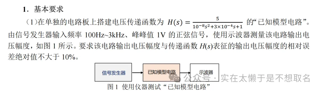 第三问是要让将探究装置的输出端连接“已知模型电路”的输入端,如图 2 所示。设置探究装置输出 1kHz 的正弦信号,并依据基本要求(1)中的 H(s)确定输出信号幅度,使得“已知模型电路”输出电压峰峰值为 2V。要求该电路输出电压与设定值(2V)的相对误差绝对值不大于 5%。