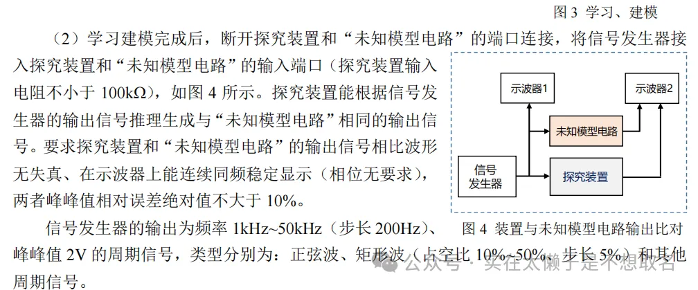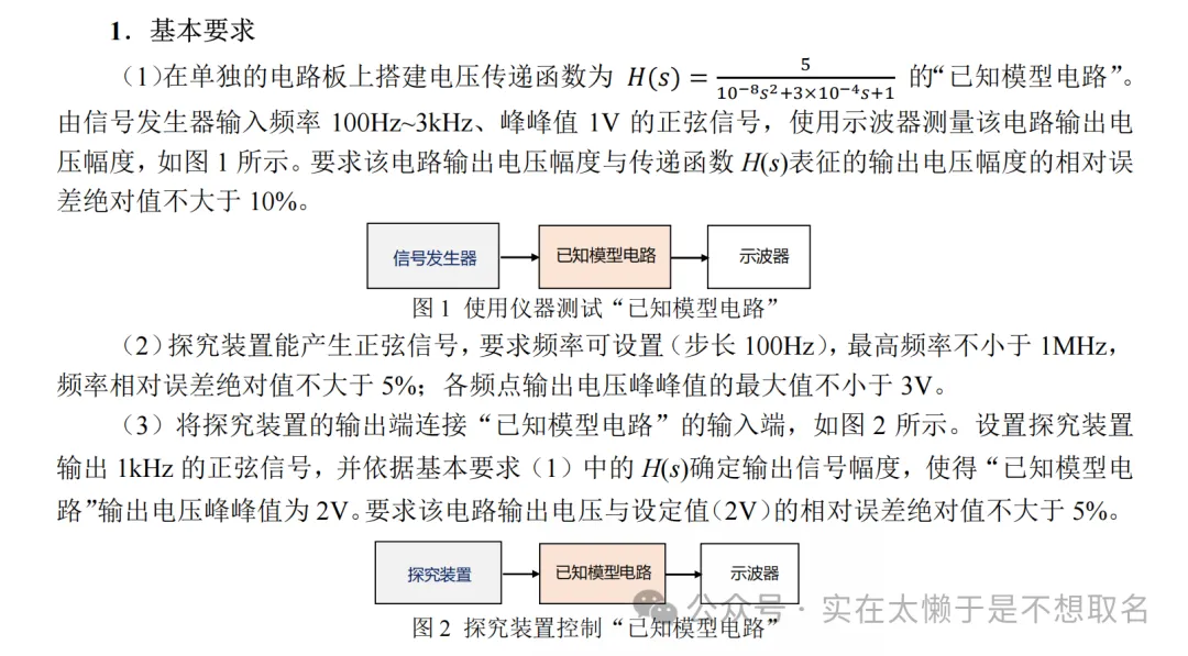 这次电子设计大赛的G题题目是:《电路模型探究装置》设计并制作RC有源滤波电路(简称已知模型电路)和电路模型探究装置(简称探究装置)。基本要求中,探究装置可自动调节本身的输出信号并加给“已知模型电路”,使该电路按要求输出信号;发挥部分中,探究装置可对测评现场提供的“未知模型电路”进行自主学习、建模,并根据该电路输入端的信号推理生成与该电路相同的输出信号。