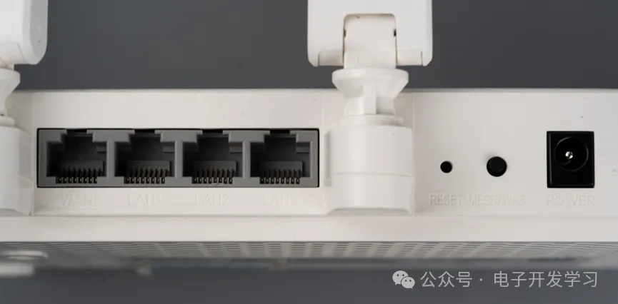 背面有四个网口,其中左边第一个是WAN,剩下三个是LAN口。右边是RESET按钮孔和MESH按钮,看起来这个可以一键MESH组网。最右边是DC电源插孔。