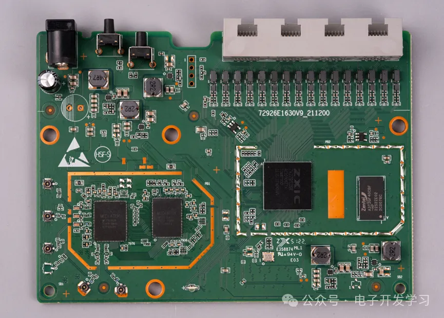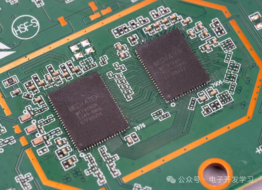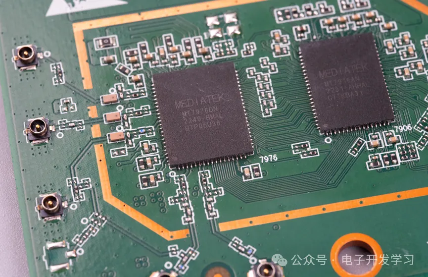 这一块是无线射频相关电路。其中MT7916AN是一颗无线基带芯片,而MT7976DN是一颗无线射频芯片。