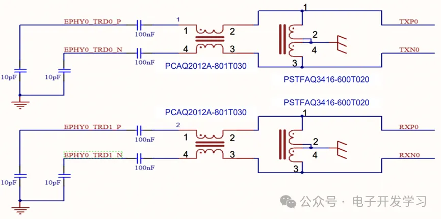 原理图中把2和4引脚连接再一起再接到隔离地,就构成了一个有中间抽头的网变,这是单口10M/100M的图。