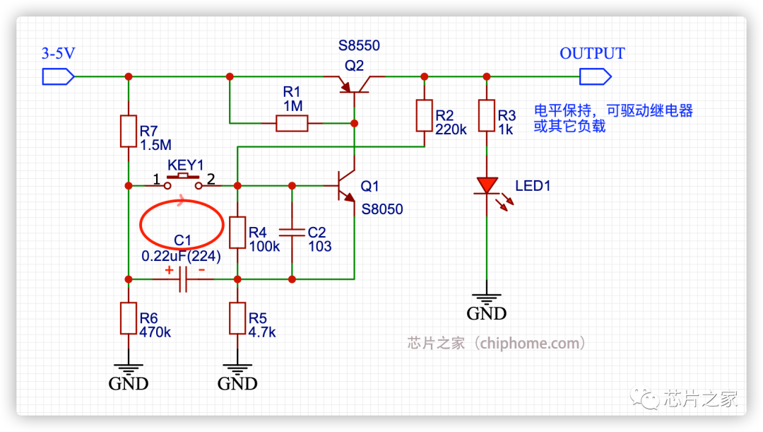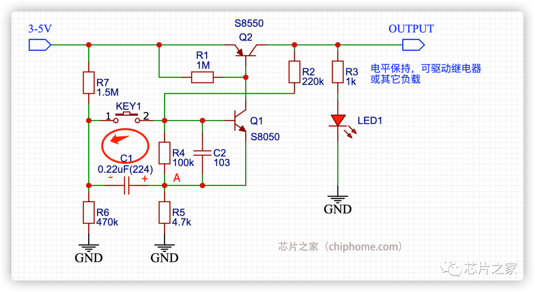 3、Q1开启后,如下图,PNP三极管Q2也会同步开启,Q2开启后,OUTPUT端输出一个略小于5V的电压,可用于驱动负载,那么Q1如何一直开启呢?