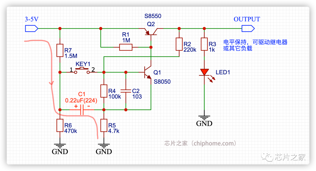 4、Q1开启后,如下图,PNP三极管Q2也会同步开启,Q2开启后,OUTPUT端输出一个略小于5V的电压,此时,A点电压经过Q2跟Q1,电压差不多略大于4V,这样,就使得C1的电压发生了反转,C1出现了左负右正,当按键按下的时候,C1通过R4,KEY1放电,R4电压为上负下正,Q1关闭,Q2关闭,OUTPUT没有了输出电压,大家可以在OUTPUT下拉一个电阻,这样就可以保持低电平了。