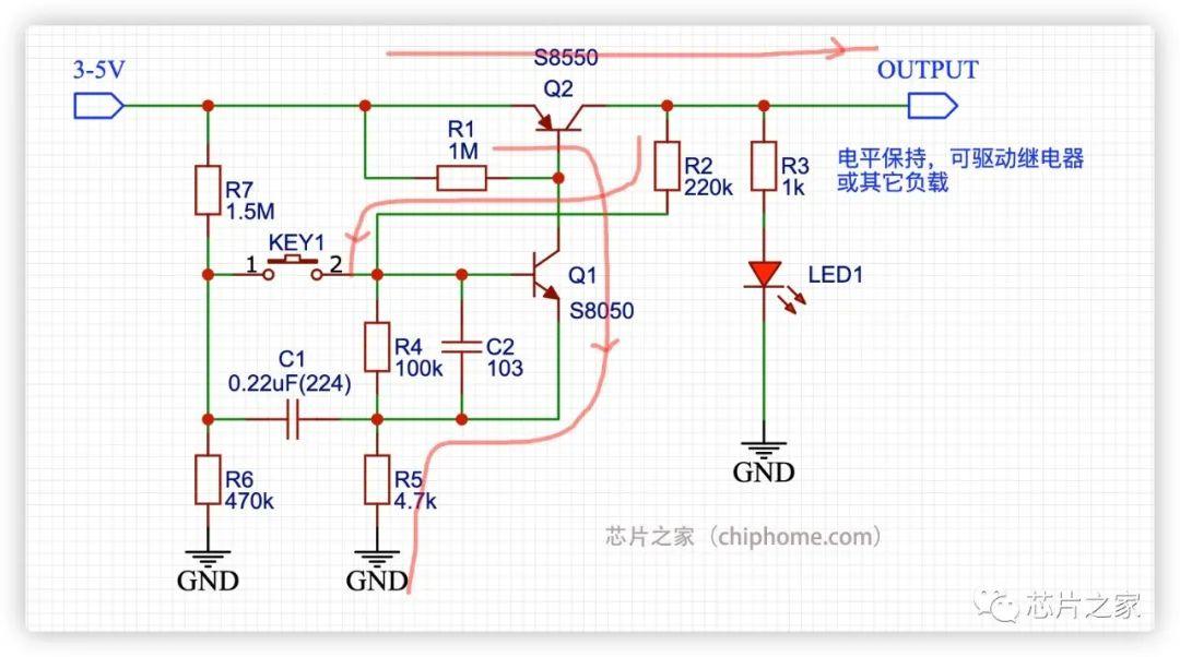 我们看另一条回路,Q2导通后,输出电压通过R2,R4,R5到GND,此时,Q1的基极有足够的电压保持开启,整个电路也进入一个稳定的状态。