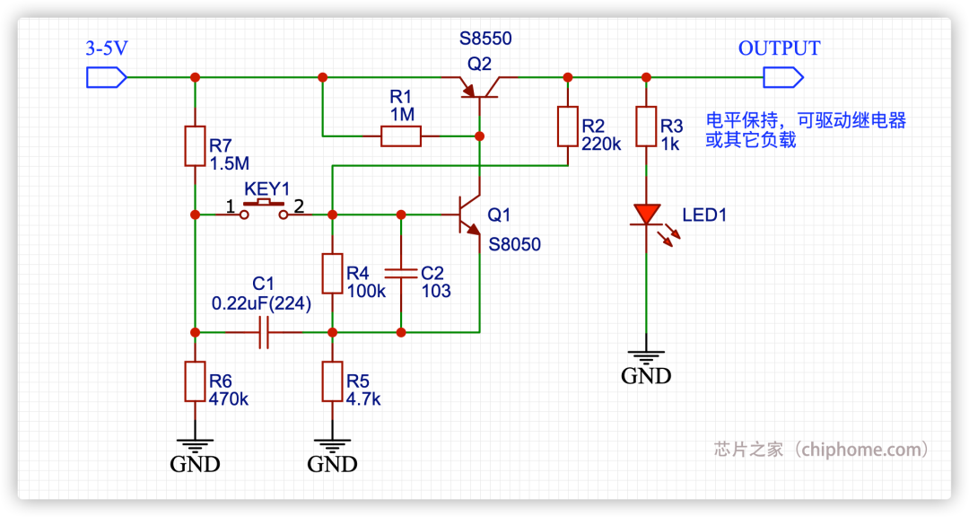 如果现在给大家出一个题目,要求用最低成本,稳定可靠的实现一个按键开关电路,也就是按一下按键,IO口输出1,再按一下,IO口输出0,并且电平要保持状态。