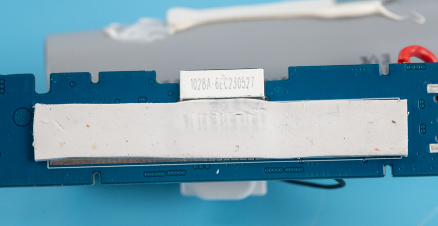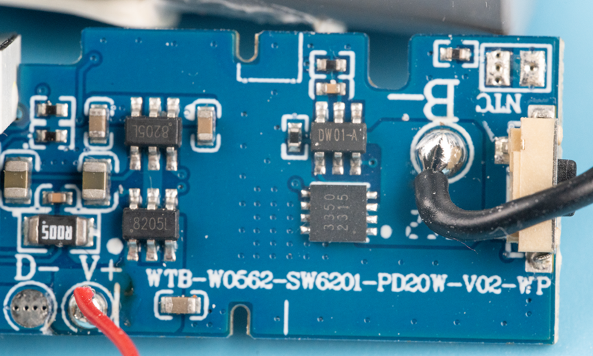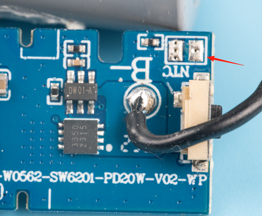 按最初拆解开这个图看,通过散热硅脂片连接电芯和电路板背面裸铜,理论上做到这一步,只需要在板子上放一个NTC然后连接到芯片的14脚就可以实时检测电池、电路板温度。但是实际上我却没找到这个NTC。