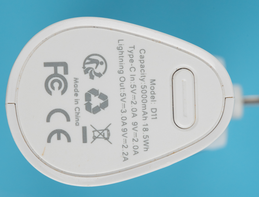 另一个侧面写着型号是D11,容量5000mAh,充电输入5V2A或者9V2A。Lighting输出口的输出功率是5V3A或者9V2.2A,这几乎能给使用Lighting接口的苹果手机以最快的速度充电了。