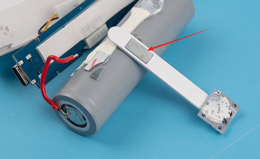 这个支架是金属的,上面还镶嵌了一个磁铁,用来确保不适用的时候,支架吸合在充电宝外壳上。