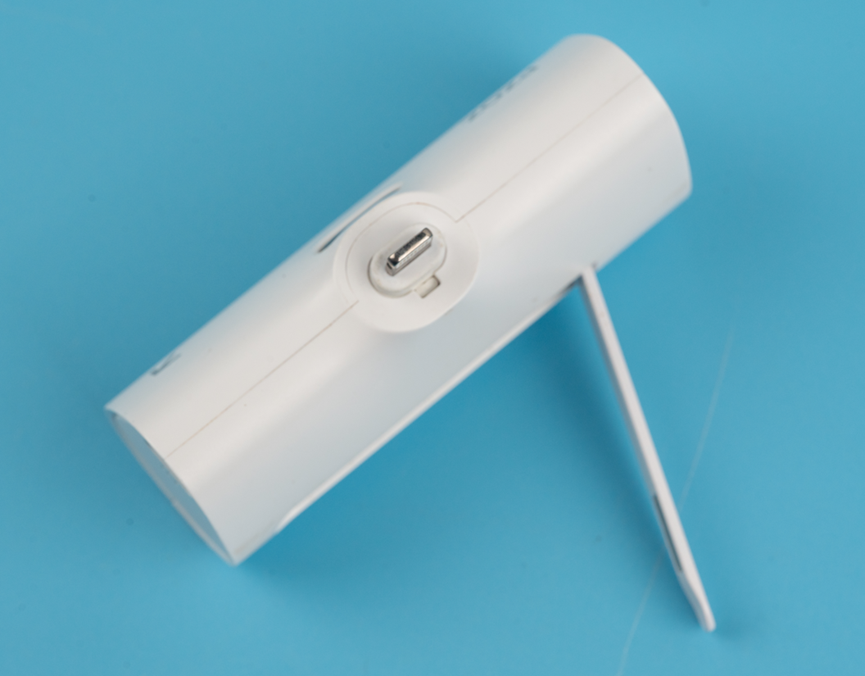 这个充电宝设计的蛮有意思。它的输出固定在外壳上,用的时候直接插入手机底部的充电口即可。侧面有一个便携支架掰开之后,就可以当作手机支架用。