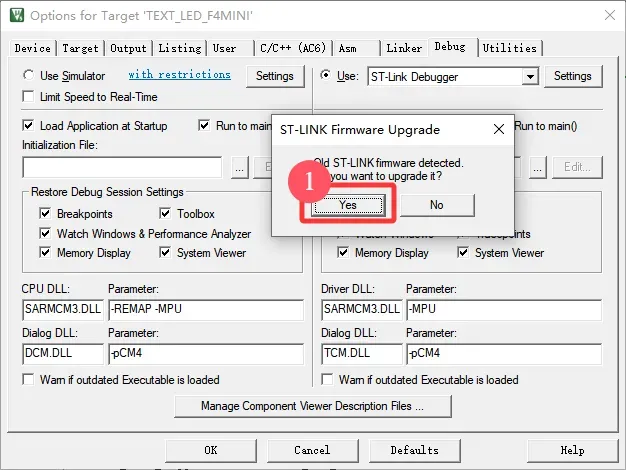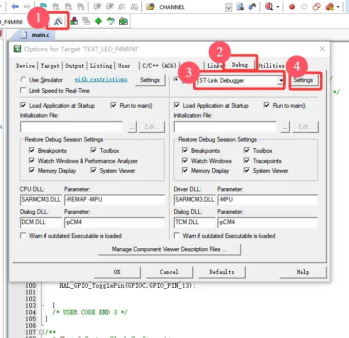 打开Keil5,如图所示选择进入ST-Link配置界面