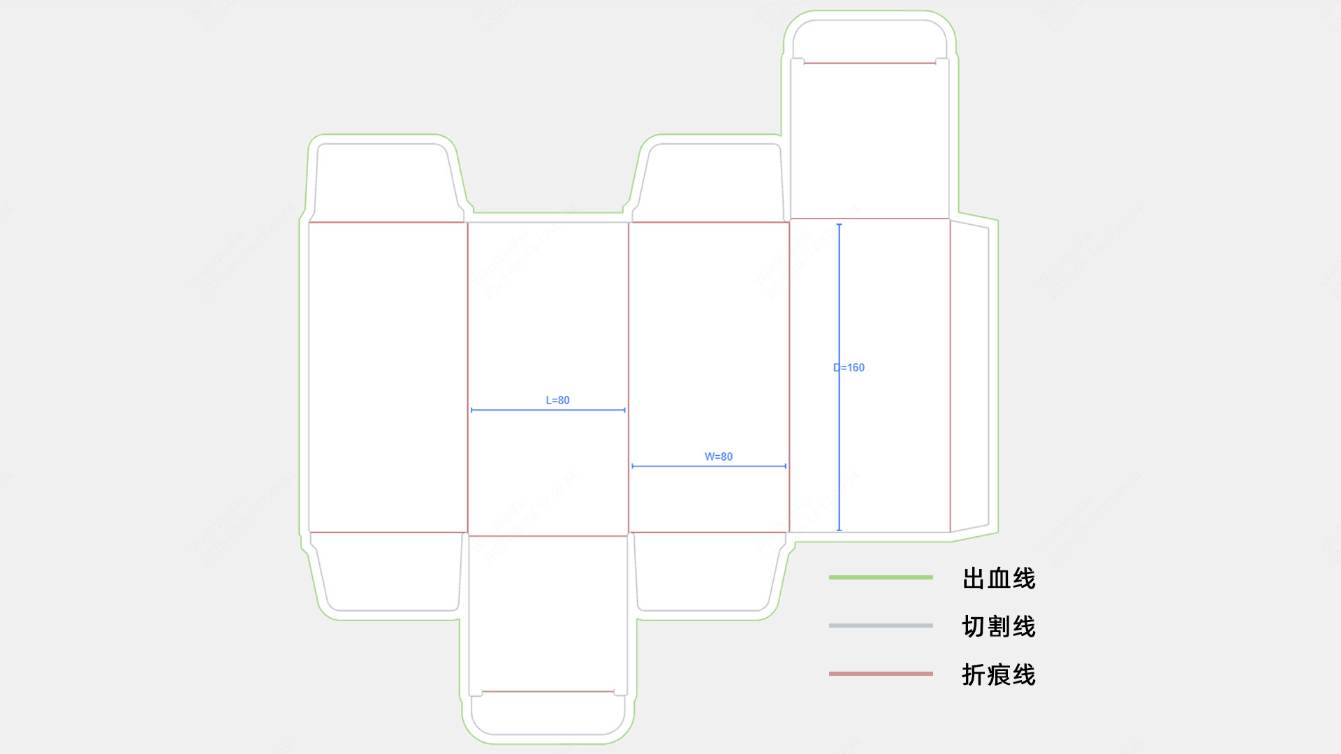 出血位的尺寸该留多少?不同类型纸箱有讲究,需根据纸箱类型、尺寸和裁切方式灵活调整。嘉立创纸盒的刀模文件都添加了出血,出血位统一为8mm。如飞机盒的尺寸为150*150*50mm,则印刷文件的尺寸需要设置158*158*58mm(四周各加 8mm)。