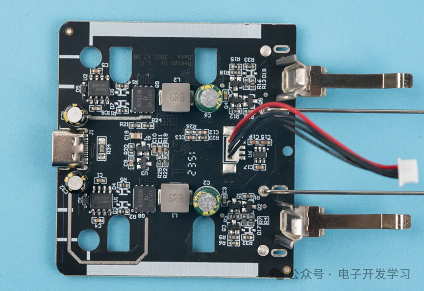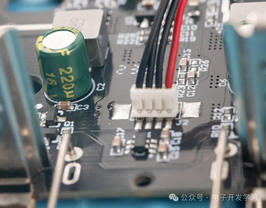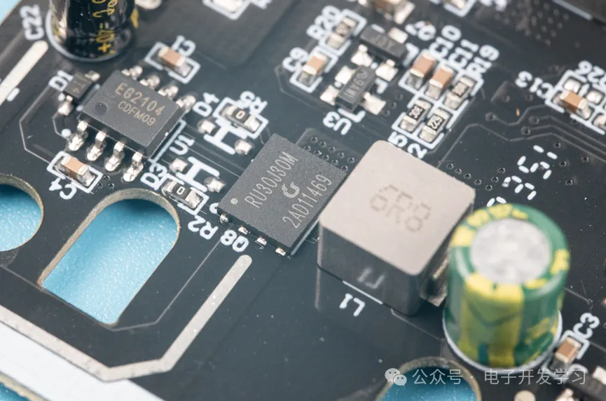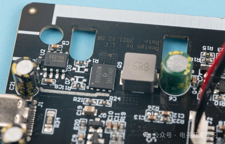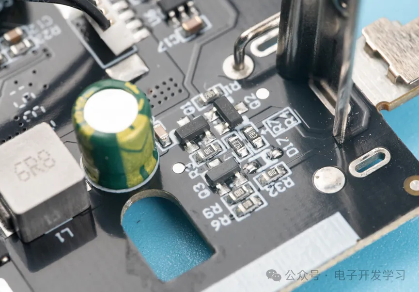 这是一颗PD协议芯片,用来处理USB2.0和CC信号,实现从充电头获取9V、12V等电压输出。协议芯片虽然把丝印打掉了,但是看走线,CC1和CC2以及USB信号的连接方式,大概能看出这是来自南京沁恒的CH224K。CH224K最高支持PD3.2 140W功率、并支持单电阻配置、IO电平配置及I2C配置。芯片集成度比较高,可以用于无线充电、小家电、锂电池电动工具等各种场合。