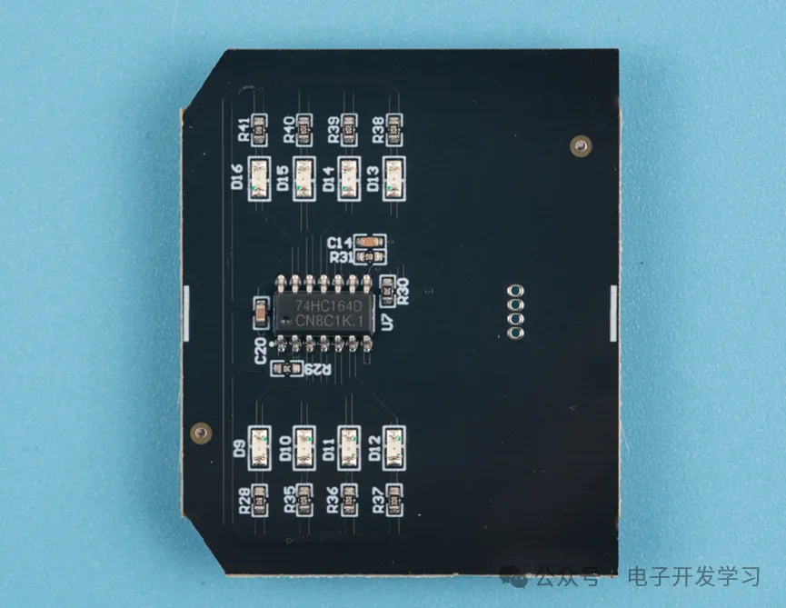 正面用了一颗74HC164D,这是一个串入并出移位寄存器,在这里的主要用途就是扩展出8个IO用来点灯。
