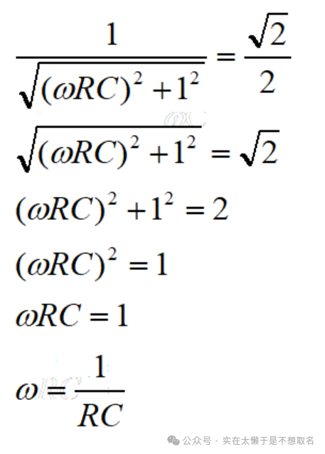 当输出信号幅度下降到输入信号幅度的0.707倍也就是-3DB的频率点即为截止频率,因此我们用0.707(约为根号2/2....1.414/2)带入式子反解出频率。