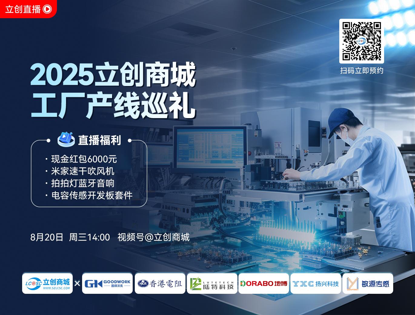 8月20日,立创商城将直击精密电子制造的核心场景,用一场产线巡礼直播为你揭晓答案!从芯片到传感器,从电阻到晶振,六家厂商将带你解锁智能制造的秘密,深入生产一线,揭秘技术细节。