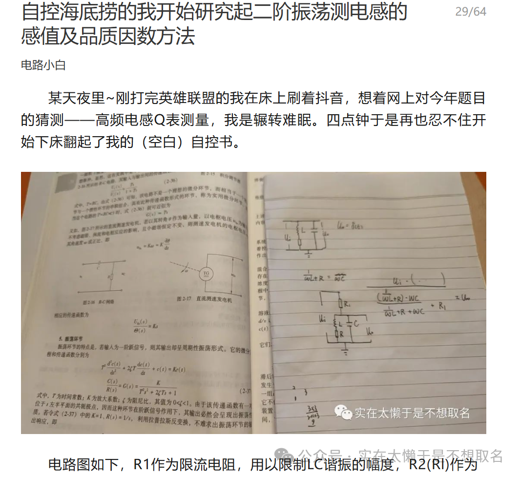 去年八月份研究过如何测量一个电感及其电阻的方案,当然是异想天开般的采用测量电路阶跃响应的办法,利用自动控制领域复平面的方式来测量电感的直流电阻与电感量的方法,不过受困于自己的理论水平有限,文章写到一半难以进展。
