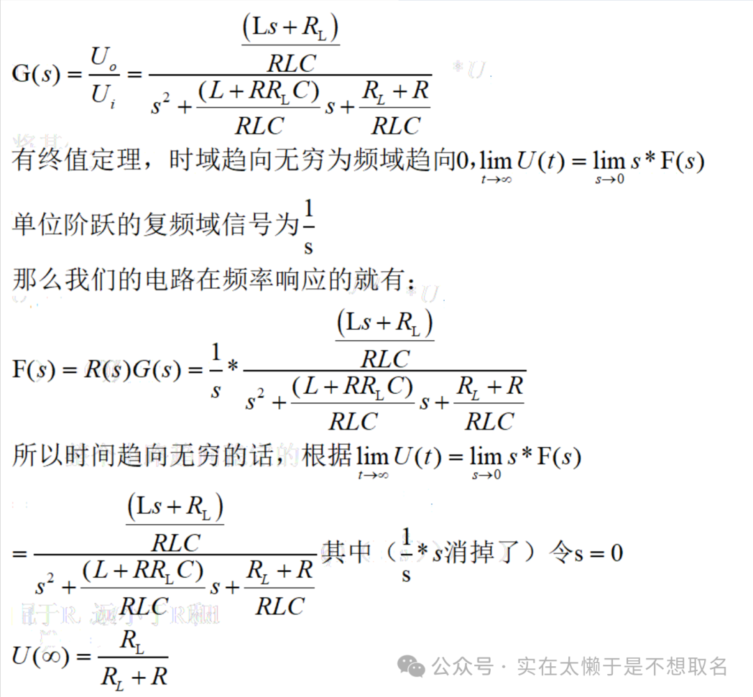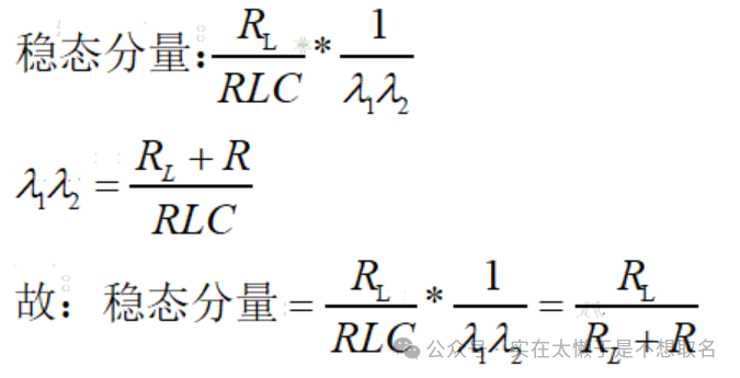 其实这个公式也好理解,当阶跃信号(开关信号)稳定后,相当于直流信号, 电容的阻抗为无限大,电感的阻抗为0,因此相当于电阻R和等效电阻RL串联分压 。