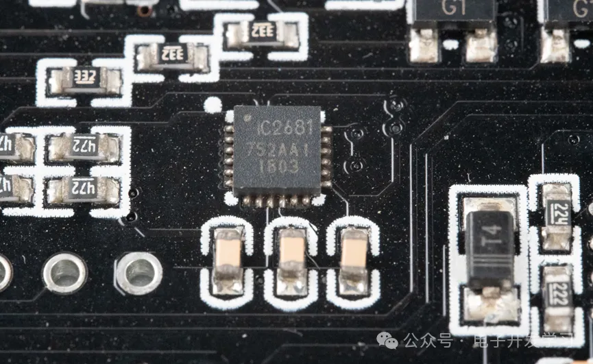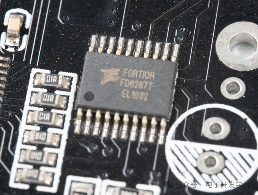既然是一个电机驱动板,肯定要有驱动MOS的器件,这个板子采用了FD6288T。FD6288T在电机驱动领域算是老熟人了,尤其是航模、无人机、穿越机上的电调,基本上用的都是FD6288Q这个料。