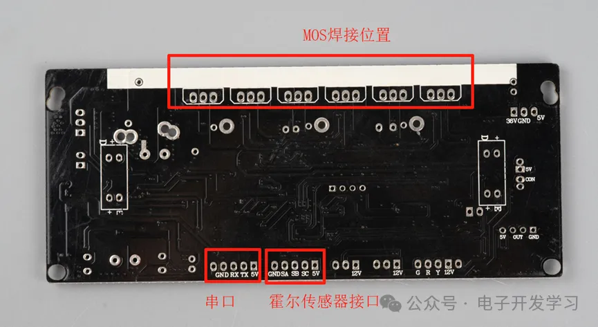 板子上有六个TO-220的MOS,但是实际上并没有焊接。板子下面是串口和霍尔传感器接口。从背面看的很明显的是:板子上的插件都没有焊接,尤其是6颗MOS和一堆插件电解电容,补全这些器件要花十几块钱了。