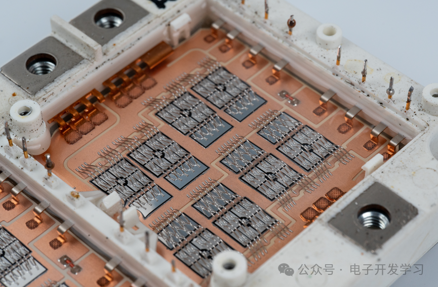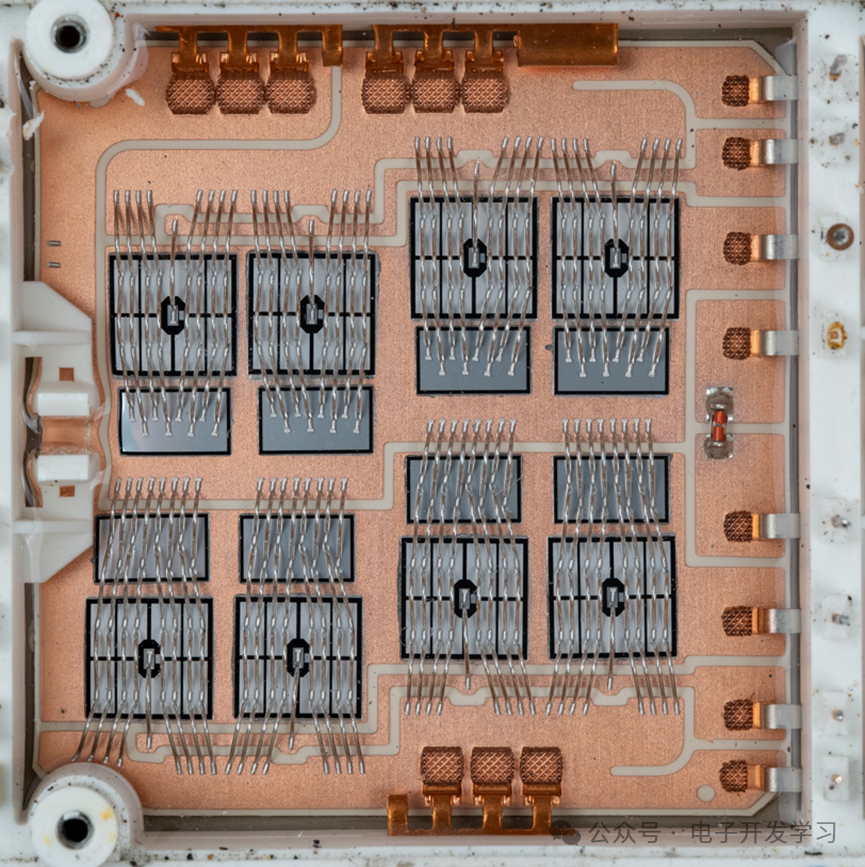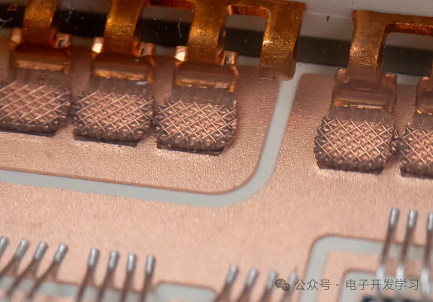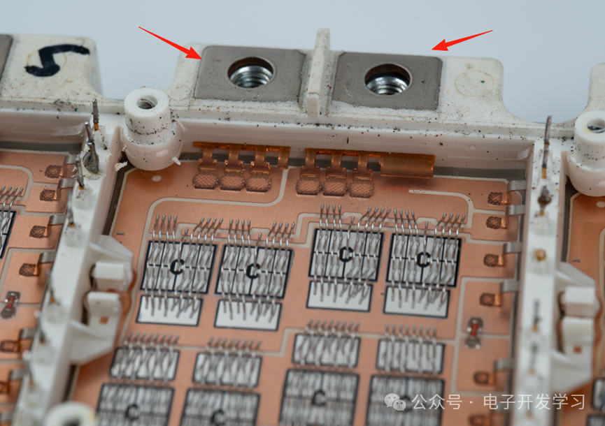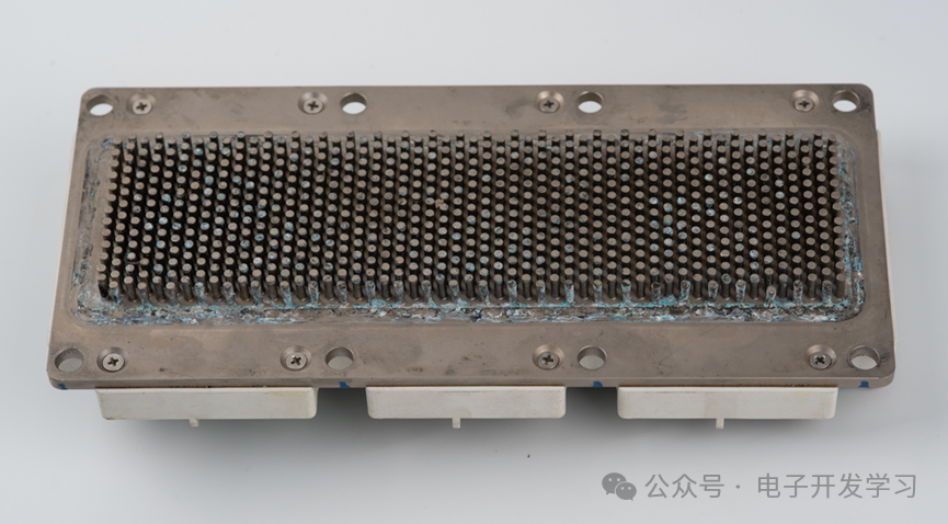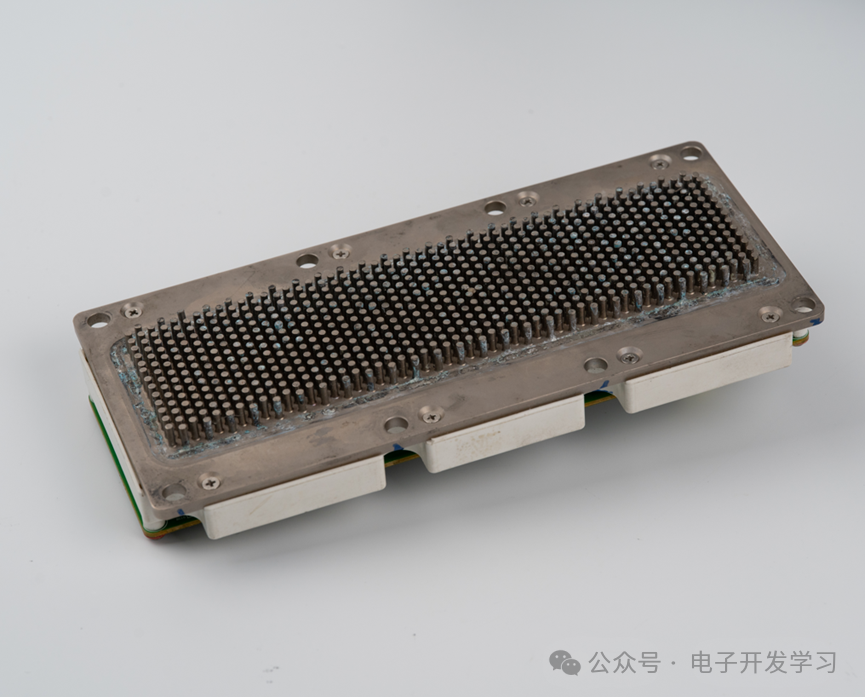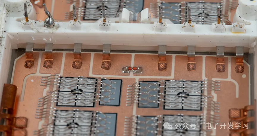 换热柱所在的金属板和电路板之间有一层很厚的陶瓷。功率相关的电路就封装在这个陶瓷壳里。