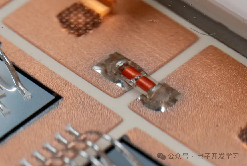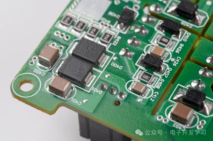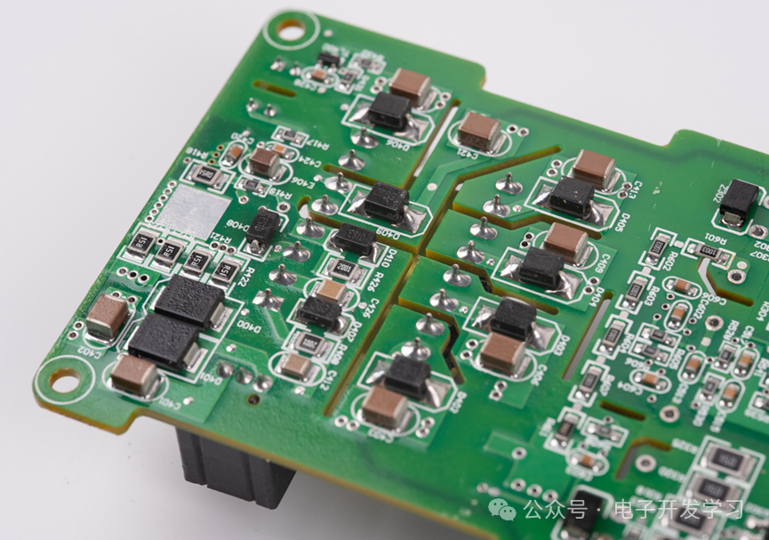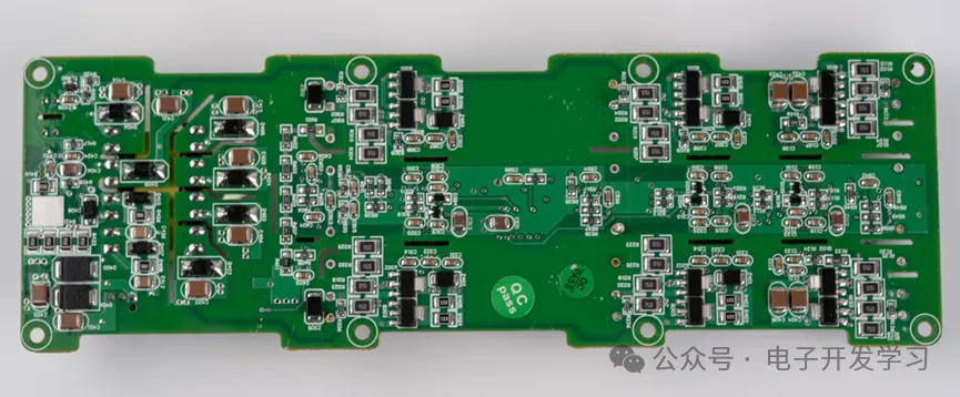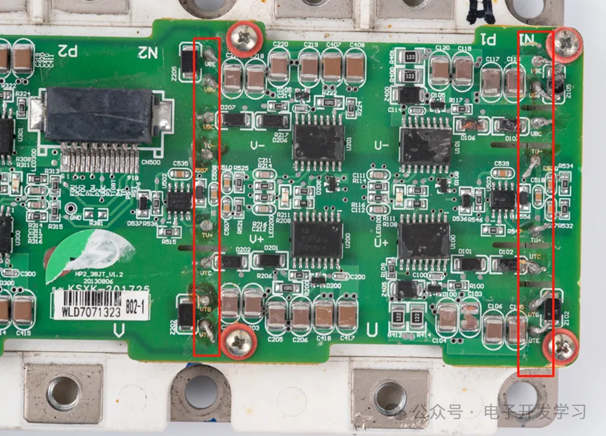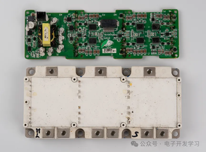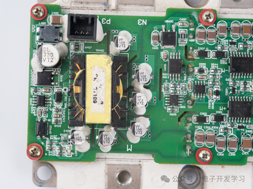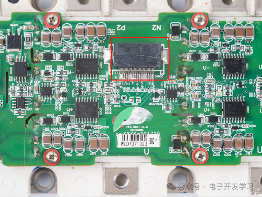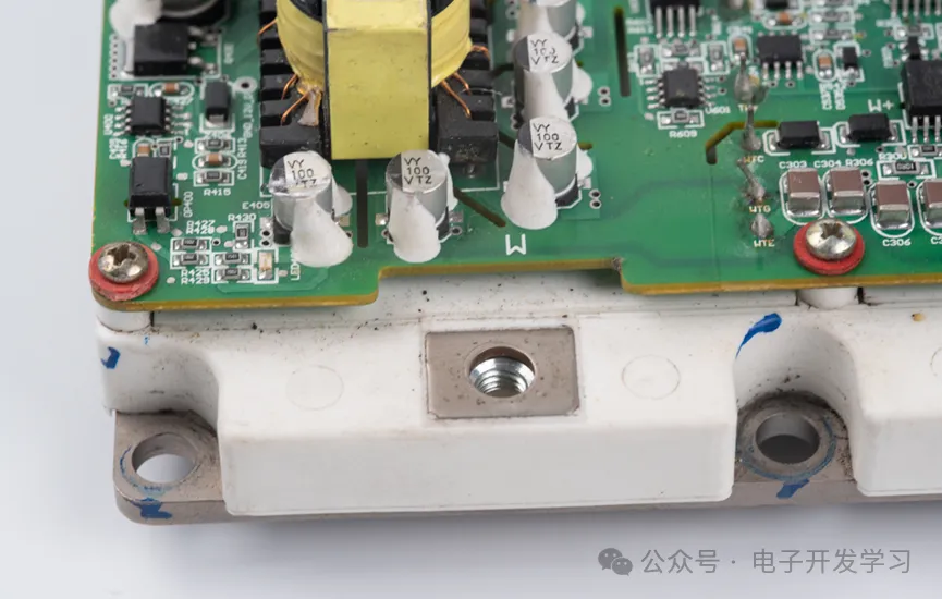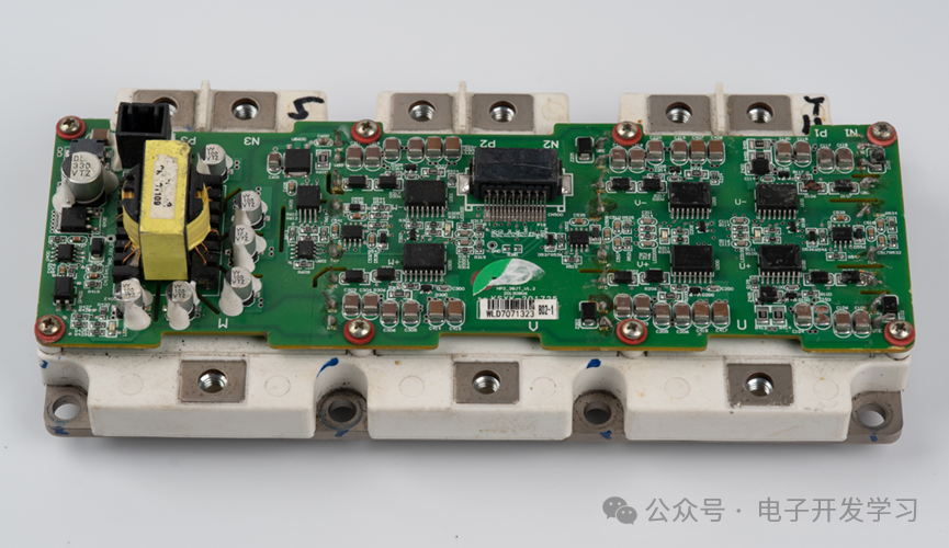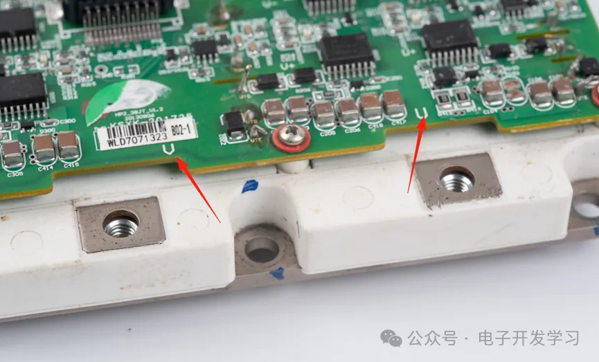 上面这个绿色的板子,作用就是栅极驱动。栅极驱动信号最终通过这些通孔焊点传递到功率器件上。