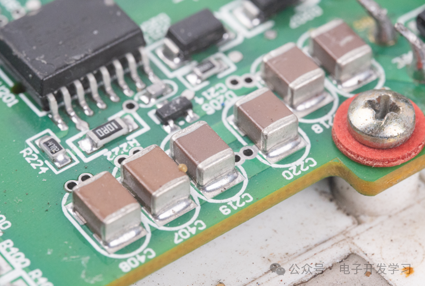 板子上用了很多看着价值不菲的超大的MLCC电容,电容的封装是1812,不同颜色的尺寸稍有差别。至于容值和耐压等级就不得而知了,但是显而易见,这种电容价格不便宜,一颗单价估计不低于1块钱。