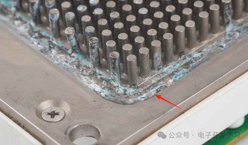 背面整个是一个金属板,金属板上生长了很多小圆柱。结合四周的压痕可以看出,这上面应该还有个壳,壳上加两个水管就可以实现水冷了,其本质是一个简易换热器。