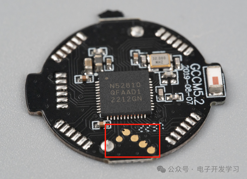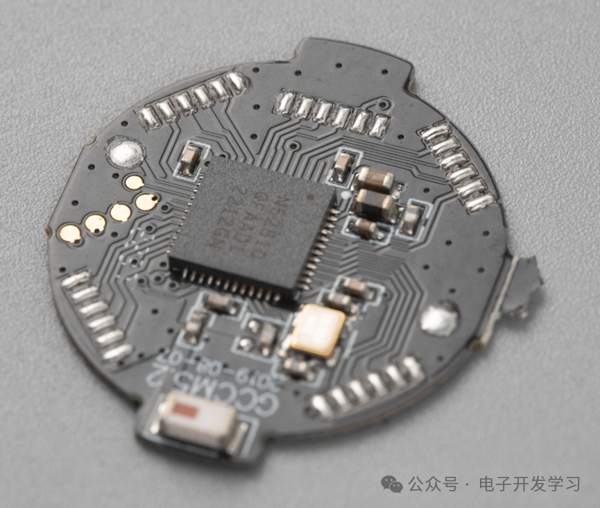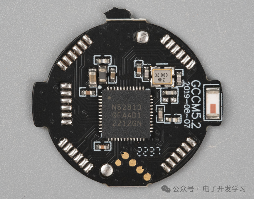 1前几天花了2.7元淘了一个NRF52810的小板子。这看起来应该是什么便携或者穿戴类产品里的板子,圆形的板子上面一颗NRF52810-QFAA芯片,一个32MHz晶振,一个陶瓷贴片天线,再就是一些阻容感了,板子非常简单。