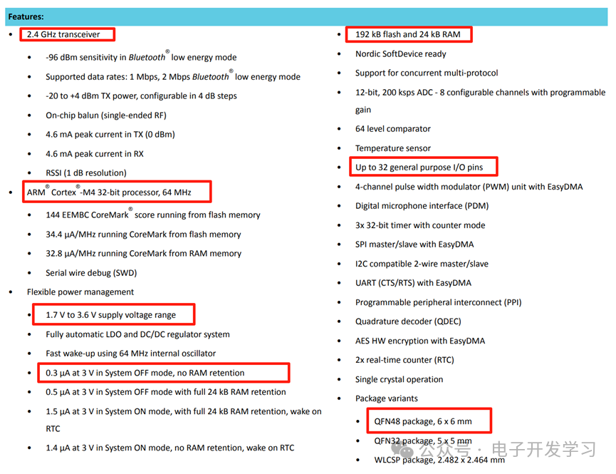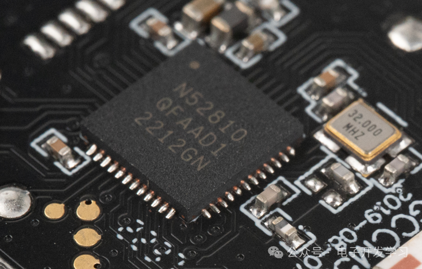 NRF52810性能不算低。它有M4的内核、2.4G无线收发器支持低功耗蓝牙、1.7到3.6V的宽供电范围、0.3uA的最低功耗、192KB Flash和24KB RAM的存储空间、最大32个IO口。算是一个性能不错的蓝牙SOC。