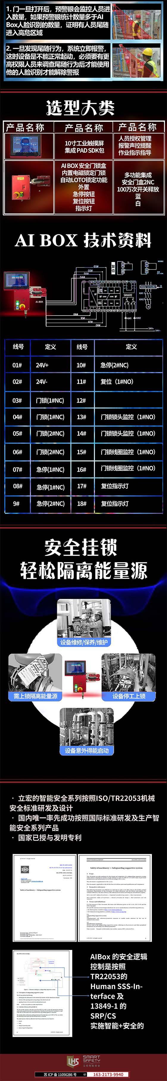 在智慧安全领域,设备的本质安全与人的本质安全两者需要完整的结合,完全依靠设备的本质安全不够,依靠人的行为安全,更是不可取,在LHS智慧安全的应用中,你将看到设备的本质安全与人的本质安全结合· 什么是设备本质安全: —设备的基本安全防护装置,防护罩,安全光栅,安全控制器,安全门锁等 —设备的安全控制系统监控,达到PLd以上双通道,高可靠性安全控制系统 —设备的安全实时监控,安全装置与人的行为结合使用 —设备出现不安全状态的锁定,人的不安全行为设备的安全锁定 —防重启预警功能 —报警状态安全锁定功能·人的本质安全 —作业授权管理,经过授权培训的人方可操作岗位 —作业统一管控,智能判定违规现象,安全锁定设备 —防止尾随预警、报警 —实时报警功能,安全停止