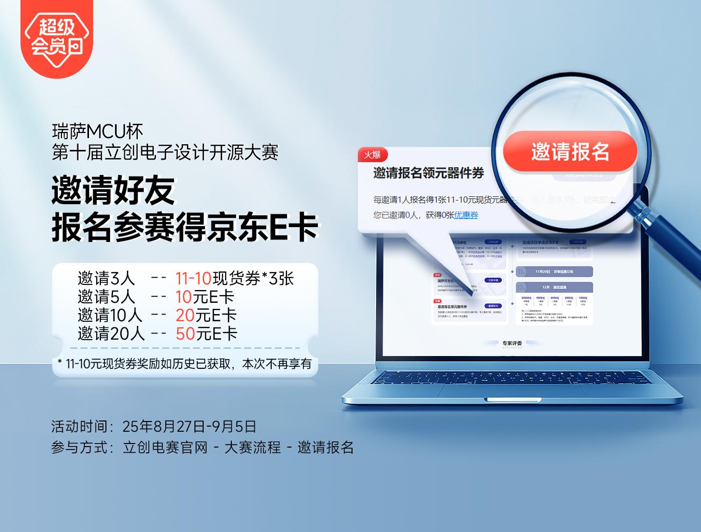 即日起,邀请好友报名电赛,最高可得50元京东E卡奖励!